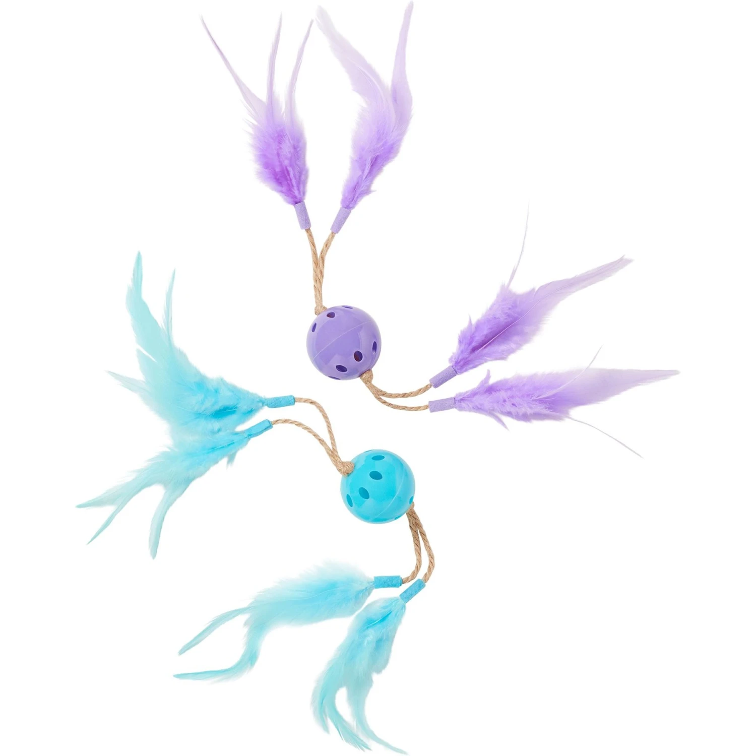 - Two plastic balls adorned with feathers via sisal rope on either side entice your kitty’s natural hunting instincts.