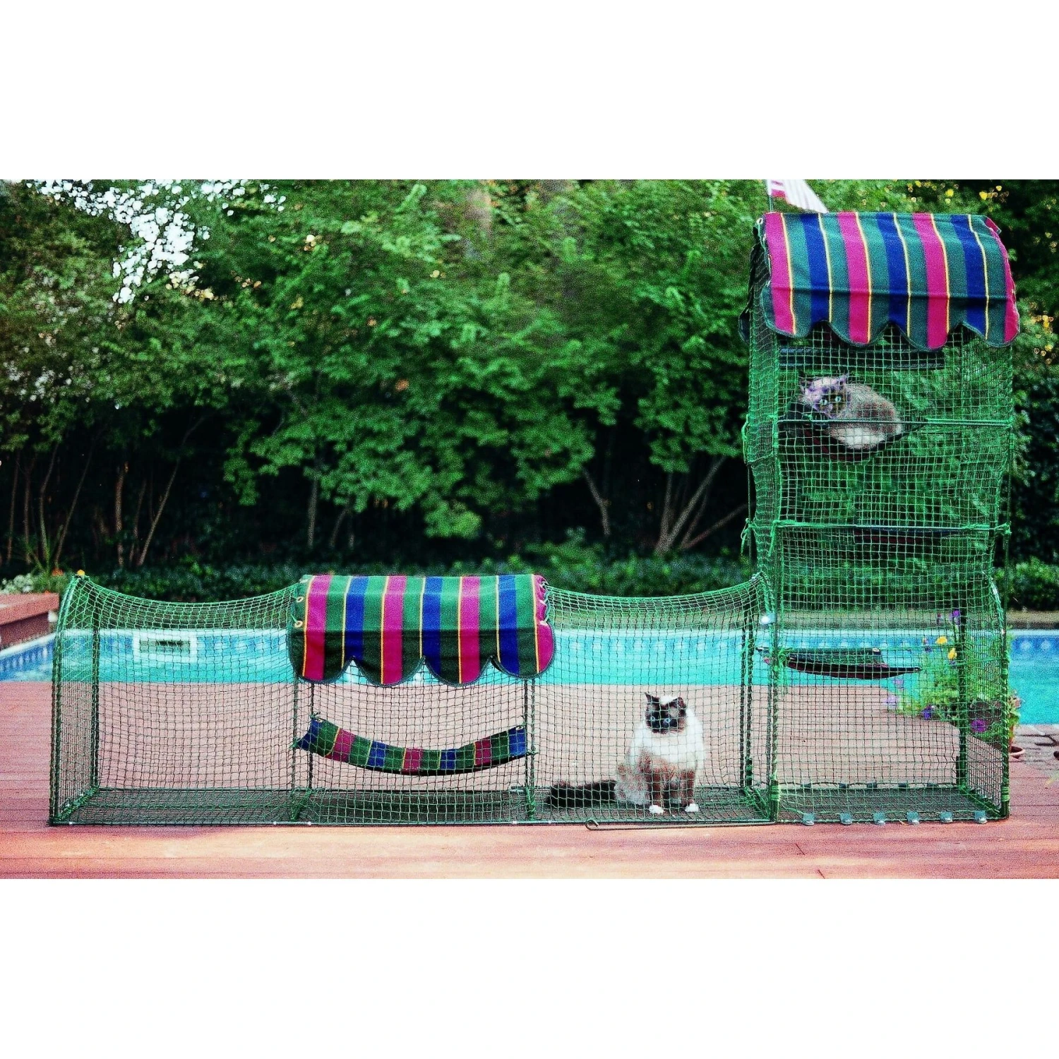 The Kittywalk Town & Country Collection Outdoor Cat Playpen is a paw-some combination of Kittywalk’s most popular products—the Deck & Patio, Kabana and Penthouse. With the 6’ Deck & Patio, and 3 levels in the 5′ Penthouse, your feline friends will have plenty of space to run, climb and explore. And when it’s time to relax, she can enjoy the Kabana, which has an awning for shade and a hammock for a nice cat nap. This impressive enclosure is made with durable steel components and rip-resistant netting that’s water-resistant for all-season fun. Plus, it comes with a compact travel and storage bag, so you can easily store it until your next outing.