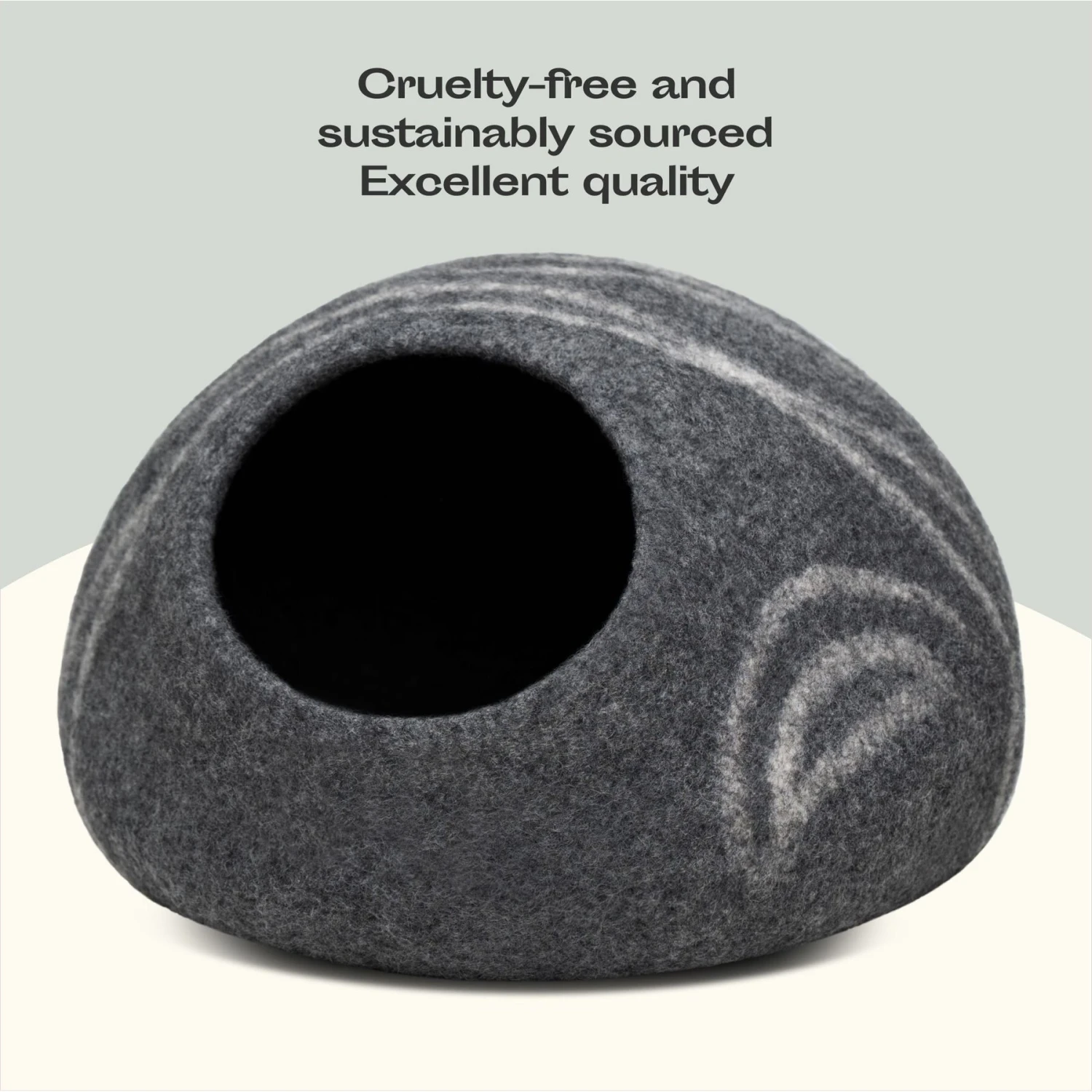 Give your cat the gift of premium comfort with the Meowfia Premium Felt Cave Cat Bed! Handcrafted by Nepalese artisans using 100% New Zealand Merino wool, this unique and innovative design is soft, supple and breathable for year-round comfort that keeps your furry friend cool in the summer and warm in winter for a purr-fect night’s sleep or just a midday catnap. It’s created using a wet-felting technique that molds the wool into a dense fabric with only soap, water and pressure; each bed is made from a single piece of fabric so there are no seams or stitching to burst or fray.