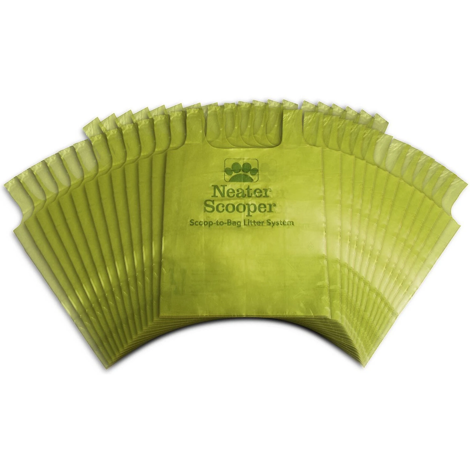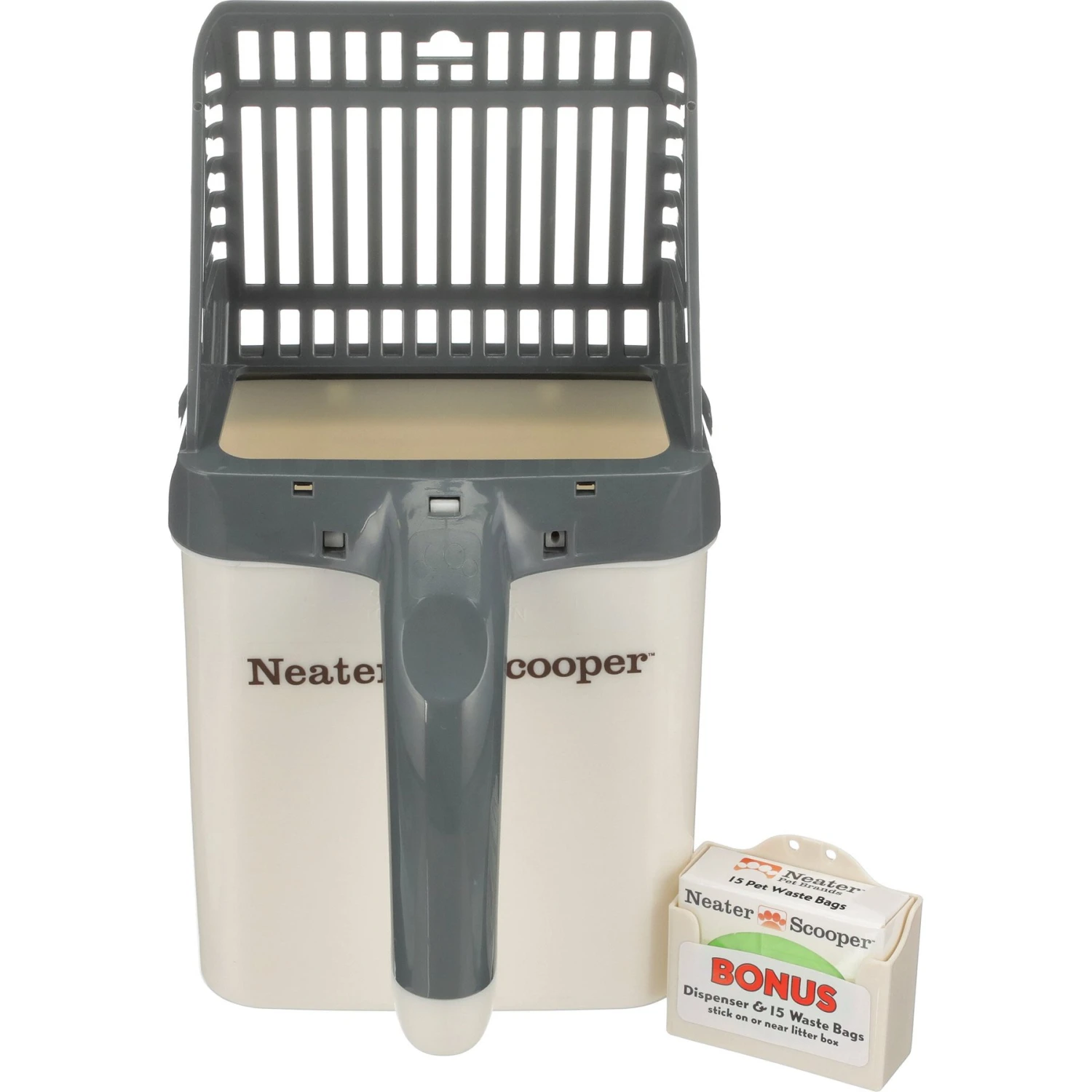 Keep your litter box fresh and clean without the hassle of traditional litter scoops with the Neater Scooper. This convenient all-in-one scooper is designed so that you scoop waste directly into an attached bin with a bag inside. This means that you no longer have to scoop from the litter box into a separate bag, which greatly reduces the chances of spilled litter. To ensure that all litter stays inside, the Neater Scooper has a trap door that automatically opens and closes while you deposit waste. Simply sift, lift, and toss the bag — no more spilled litter and messes. The Neater Scooper comes with our specially designed Neater Scooper Bags. These bags are designed to fit perfectly inside the scooper and they also have tie-handles to make disposal quick and easy. This package comes with 15 bags to get you started and replacement bags are also available on Chewy.com. Take the hassle and mess out of litter box cleaning today with the Neater Scooper!