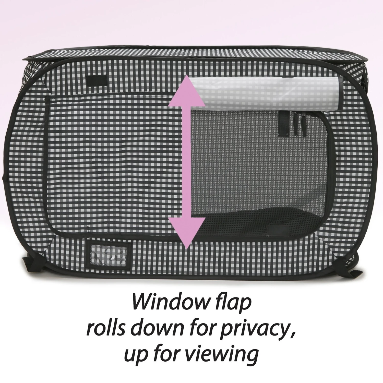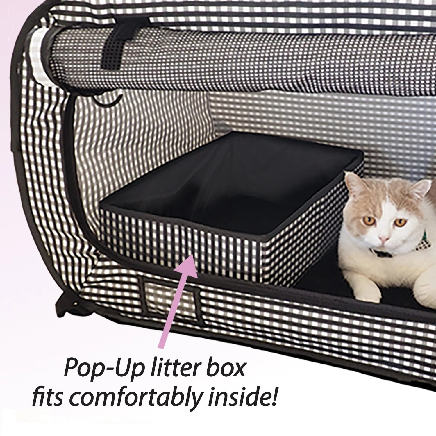 Keep your kitty safe while still providing her with everything she needs with the Necoichi Portable Stress Free Cat Cage and Litter Box Set. This set includes a cage, fleece mat and litter box for your furry friend to use during travel, when guests are over, while moving or whenever you may need it. The multi-purpose cage features two mesh panel sides for breathability and visibility to keep your paw-tner comfortable while she is inside of it. It has a foldable design and the sides can be rolled down for a little more privacy. The cage is easy to transport and store, with built-in seat belt straps for car travel. The litter box can also be folded down and snapped shut for convenient portability. Necoichi Portable Stress Free Cat Cage and Litter Box Set ensures your companion will be safe and comfortable even during stressful times.