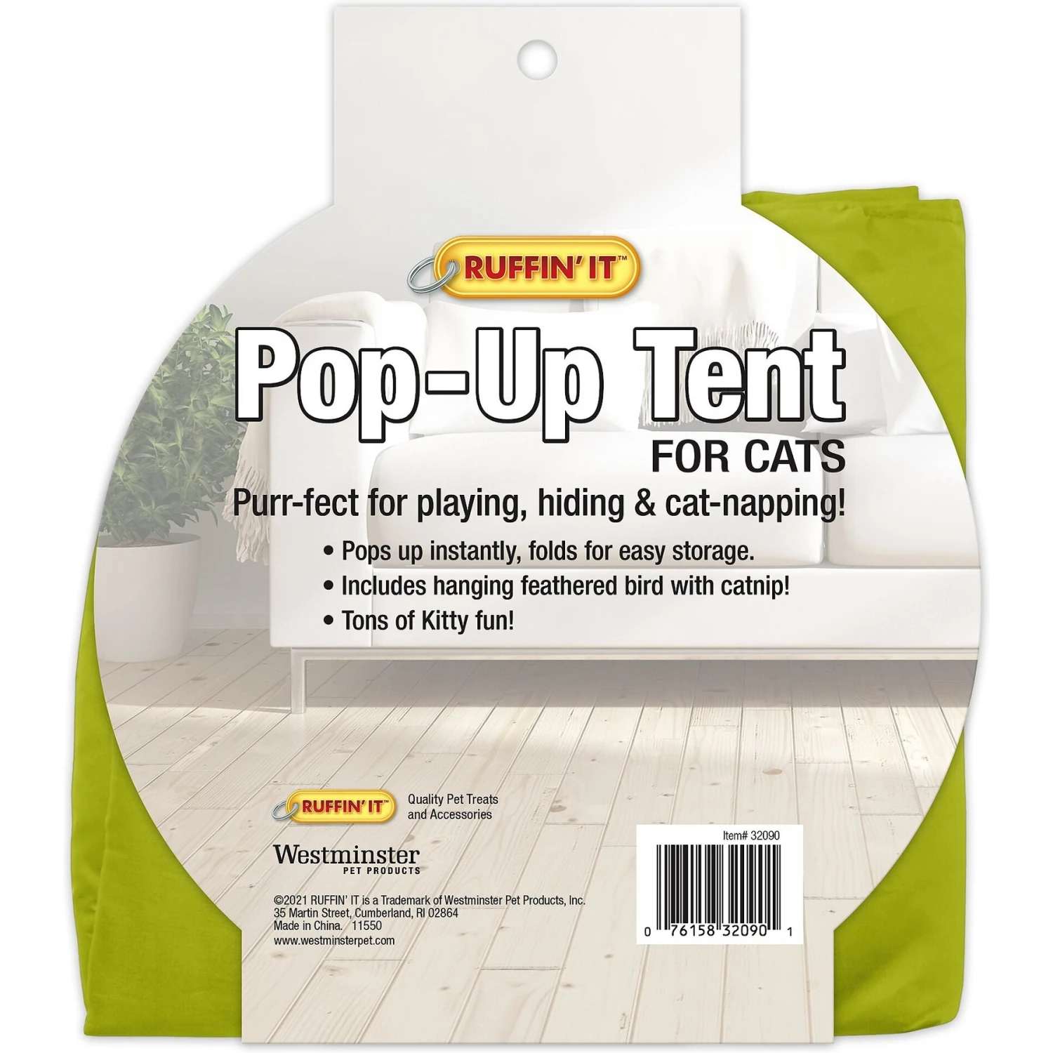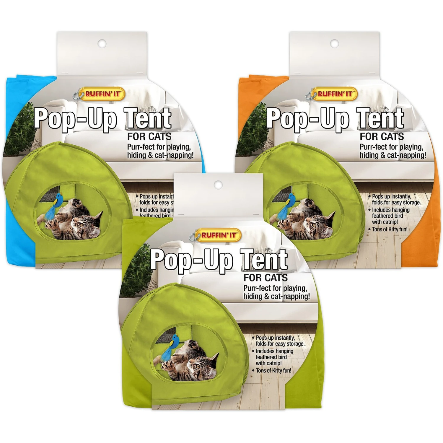 Does your kitty love to curl up and nap in her own secret spot? Then she’ll love a RUFFIN’ IT Cat Pop Up Tent Cat Toy. This cute pop-up home is specially designed for feline friends. Easy to use, this colorful tent is purr-fect for playing, hiding and hours and hours of cozy cat napping. Your kitty is also sure to enjoy the included dangling bird toy with catnip. Plus, the tent folds up for easy storage or travel, so you can bring it with you on the go.